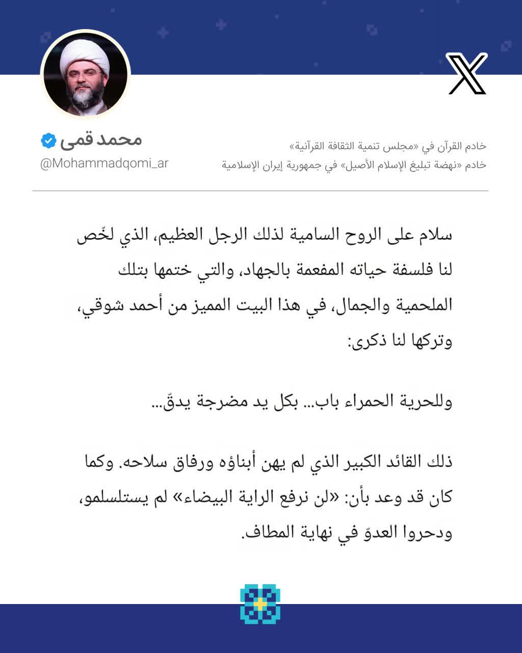 به گزارش روابط عمومی سازمان تبلیغات اسلامی، حجت‌الاسلام محمد قمی، رئیس سازمان تبلیغات اسلامی در سالروز شهادت یحیی سنوار در صفحه شخصی خود در شبکه اجتماعی ویراستی نوشت؛