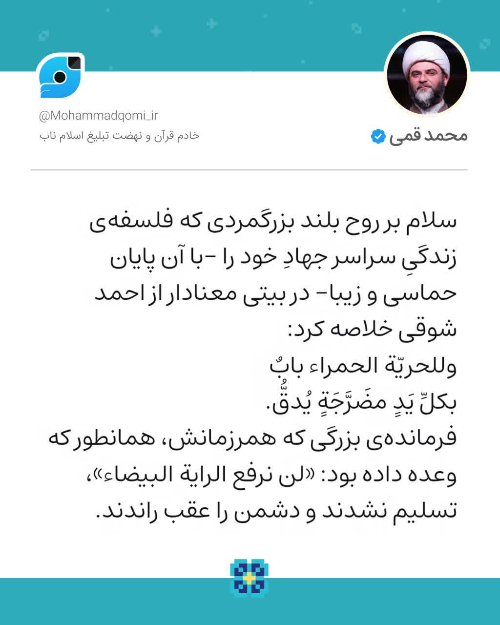 سلام بر روح بلند بزرگمردی که فلسفه‌ی زندگیِ سراسر جهادِ خود را با آن پایان حماسی و زیبا در بیتی معنادار از احمد شوقی خلاصه کرد: