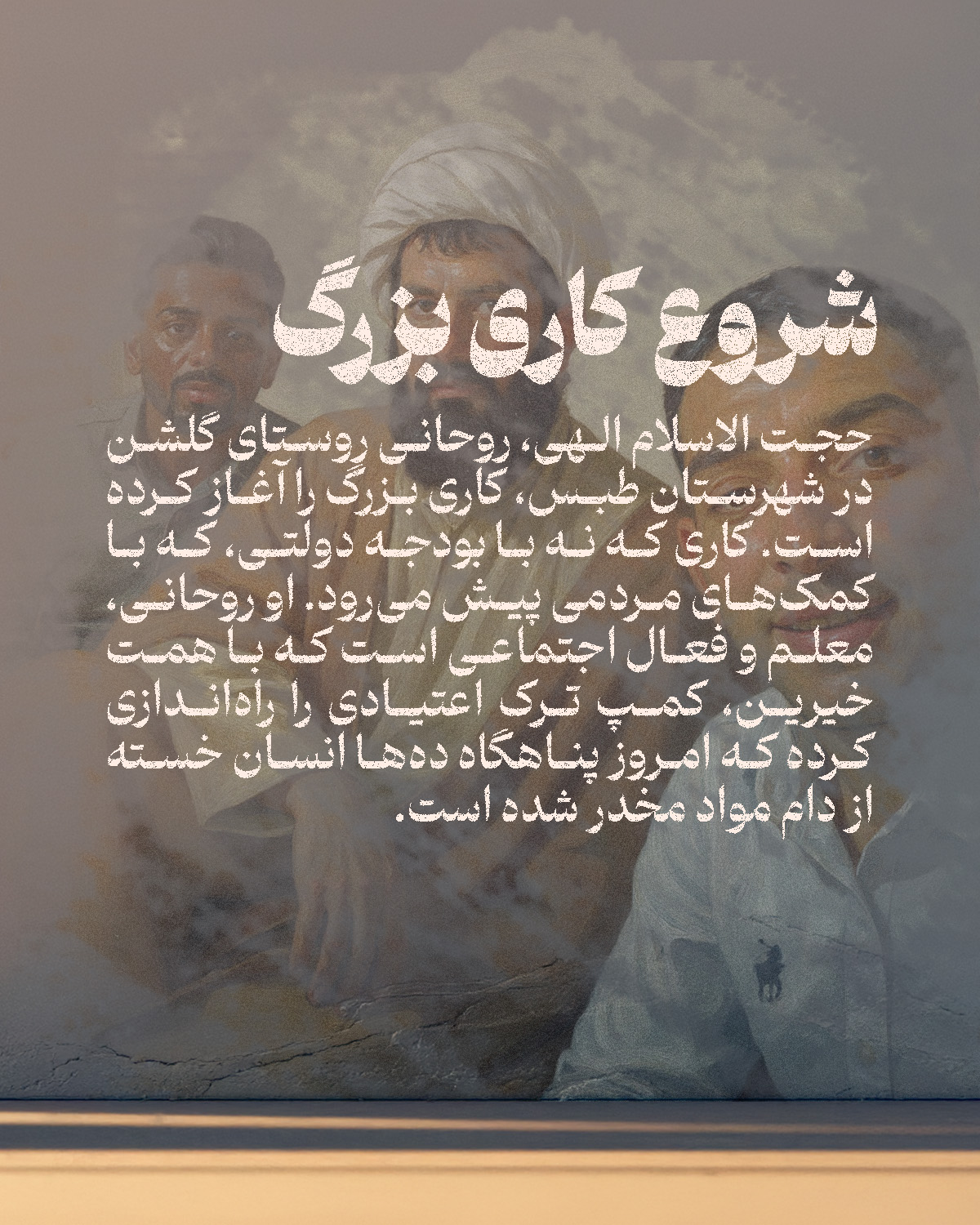 حجت‌الاسلام الهی، امام محله روستای گلشن شهرستان طبس است. روحانی جوانی که با همت خیرین در این روستا کمپ ترک اعتیاد راه انداخته و امروز پناه ده‌ها انسانی است که از دام اعتیاد رها شده‌اند. در این نشریه دیجیتال مروری می‌کنیم بر ابتکار این روحانی دغدغه‌مند و تلاش‌های او در راستای حل بحران اجتماعی محله.
