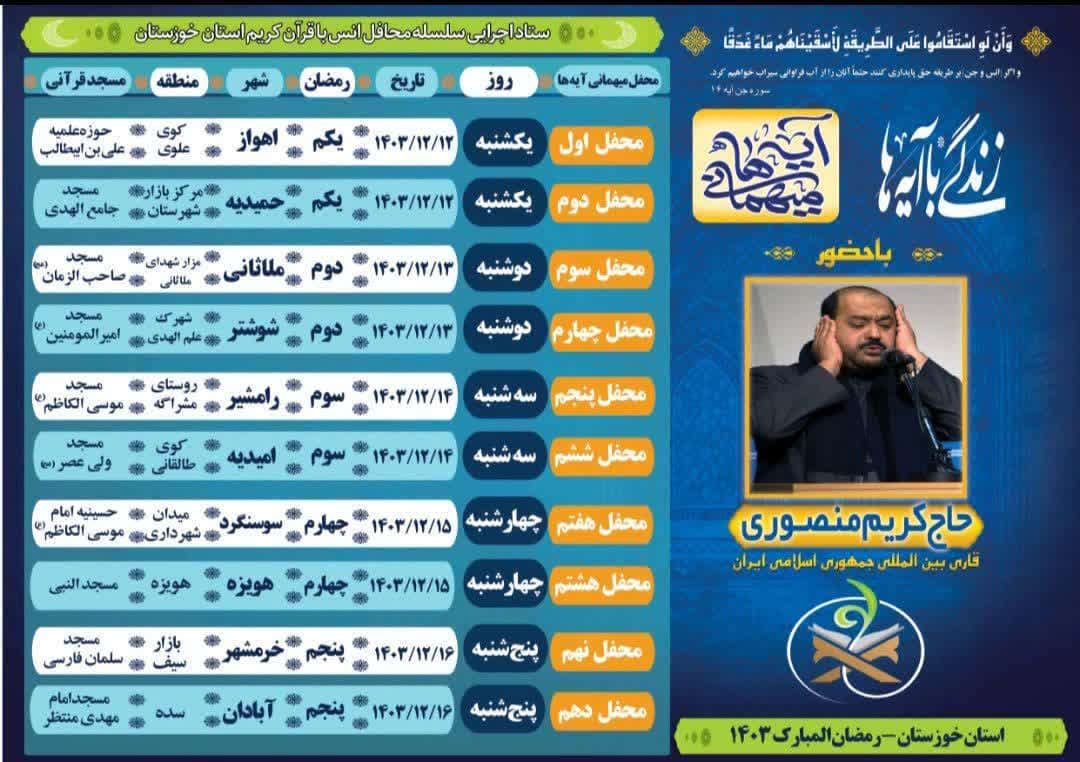 به گزارش روابط عمومی سازمان تبلیغات اسلامی ویژه برنامه مهمانی آیه ها در خوزستان برگزار می شود.
