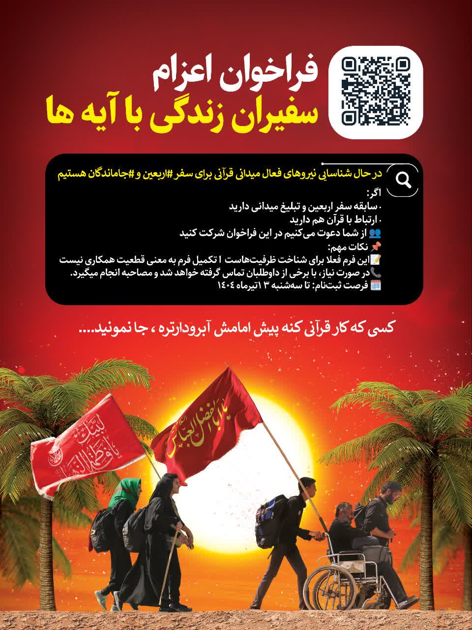 در این فراخوان از فعالان قرآنی و نیروهای داوطلب دعوت شده تا با ثبت مشخصات، آمادگی خود را برای خدمترسانی و مشارکت در برنامههای قرآنی با محوریت «زندگی با آیهها» در سفر اربعین ویژه زائران طریق و جاماندگان اعلام کنند.