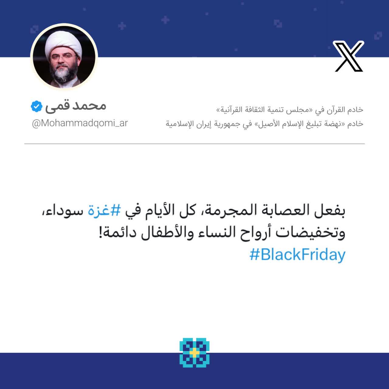 به گزارش روابط عمومی سازمان تبلیغات اسلامی، حجتالاسلام محمد قمی، رییس سازمان تبلیغات اسلامی همزمان با موج گستردهی تخفیفهای بازار جهانی و داخلی و افزایش تب حراج (موسوم به جمعهی سیاه) در صفحات شخصی خود در شبکه اجتماعی ویراستی به فارسی و ایکس به عربی نوشت؛